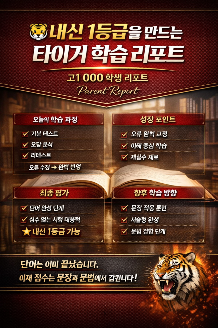 단어 학부모 리포트 1. 오늘 수업 구조 (타이거 방식) 금일 수업은 단순 암기 확인이 아닌, **“실제 시험에서 점수를 만들어내는 구조”**로 진행되었습니다. **“틀린 문제를 다시 틀리지 않게 만드는 구조”**로 진행 2. 평가 결과 (단순 점수 이상의 의미) 단순 점수가 아니라 “오류를 제거하는 능력”이 확인된 결과 3. 오늘 수업에서 확인된 ‘진짜 실력’ 오늘 수업에서 가장 인상적이었던 부분은 단순히 정답을 맞히는 것이 아니라, **“틀린 이유를 이해하고 다시는 틀리지 않는 구조”**를 만들어냈다는 점입니다. 암기형 학생이 아니라 “이해형 상위권 학생”으로 성장 중 4. 약....... <img src="https://blogthumb.pstatic.net/MjAyNjA0MDVfNjAg/MDAxNzc1MzY4MDA4OTUw.ys1j-OjOID1KwNPqSm8Y9iAGv9DFBJCE_vVmdOFeyzsg.rMxsNR9lD0NQb49q4-Ai_8S7ckSPVfkaBJe8aHuvPUAg.PNG/%C5%B8%C0%CC%B0%C5_%C7%D0%BD%C0_%B8%AE%C6%F7%C6%AE__%B3%BB%BD%C5_1%B5%EE%B1%DE.png?type=s3" />