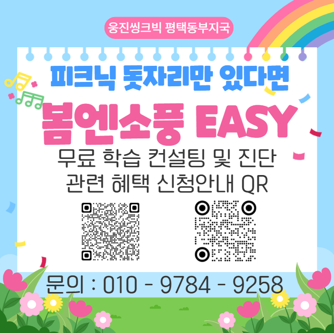 공부가 어렵다고 느껴지는 순간, 사실 아이는 “방법”을 몰랐던 걸지도 모릅니다. 약정없이 지면으로 시작 가능한 웅진씽크빅 신규회원에게는 피크닉 돗자리와 공부방 수업 등록 회원에게는 10만원 도서 마일리지를 ~ ‘ ✔ 공부가 처음이어도 ✔ 기초가 부족해도 ✔ 흥미가 없어도 괜찮습니다. “할 수 있다”는 경험부터 만들어드립니다. 지금 우리 아이에게 필요한 건 더 어려운 문제집이 아니라, 쉽게 시작해서 스스로 하게 만드는 학습 습관입니다. 지금 신청하면 무료 학습 컨설팅 + 맞춤 진단까지! 망설이는 순간, 아이의 시작은 늦어집니다. 지금 바로 QR로 신청하세요 (선착순 혜택 진행 중) 문의 : 010....... <img src="https://blogthumb.pstatic.net/MjAyNjA0MDZfNiAg/MDAxNzc1NDY5MDU4MzM0.7_FIWbWCEFZ-RErx6uFjgZi35994o0W4vVJ-4U8P-U8g.w_rPbn1wM7COwH6MbEEoZVPKUpgMMWeVSMcXX1jPjWEg.PNG/image.png?type=s3" />