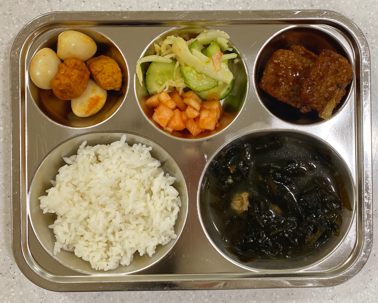 너비아니조림 어묵메알볶이 오이크래미냉채무침 깍두기 소고기미역국 쌀밥 643kcal/28g <img src="https://blogthumb.pstatic.net/MjAyNjA0MDdfMjQ5/MDAxNzc1NTM2NTg1MTg3.AYzXq4UANipxdQ-FWI5wSrd524Wg1fuSDpEe4_sNGXwg.Ouy9q5n8Pt9Y73KA0nNnS5tWmwjbodb9sFtDl3qnOFgg.PNG/image.png?type=s3" />