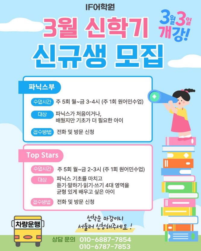 안녕하세요~~! 부산 전포동 송상현광장 앞에 위치한 이프어학원 입니다! 3월 새학기를 맞이하여 이프어학원에서 신규생을 모집합니다 !!! 새로운 학기, 우리 아이의 영어 시작을 고민하고 계신 학부모님들을 위해 아이 수준에 꼭 맞춘 체계적인 영어 프로그램을 준비했습니다 ✨ 파닉스부 대상 ✔ 영어를 처음 배우는 아이 ✔ 알파벳은 알지만 읽기나 소리에 익숙하지 않은 아이 ✔ 단어를 보고도 ‘읽는 방법’을 몰라 막막한 아이 개강일 및 수업시간 3월 3일 화요일 주 5회 3~4시 (주1회 원어민수업) Top Stars 대상 ✔ 파닉스 기초를 마치고 듣기·말하기·읽기·쓰기 4대 영역을....... <img src="https://blogthumb.pstatic.net/MjAyNjAyMDZfMTg1/MDAxNzcwMzg0NjU4NjY3.JJlTT9dv_qHeaU2qdUvBJuHA4nxV6pCWGLdAyt5P70wg.cJShXA9_v4IAw0wMW_IBr76LUKaVI77R41diLOYgFoUg.PNG/image.png?type=s3" />