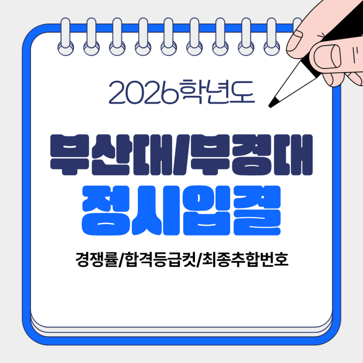 2026학년도 대학 정시모집일정이 얼마남지않았습니다 정시모집 일정과 함께 부산대 부경대 정시입결을 함께 살펴보면서 정시합격등급을 예측해 보도록 할게요! 2026 정시 모집일정 2026 정시 원서접수는 2025년 12월 29일(월)~31일(수)까지이며, 대학별 마감시간을 확인해야 합니다 정시는 가,나,다군에서 각 1회씩만 지원이 가능하므로, 지원전에 대학별 군 분류를 우선적으로 생각해야합니다 정시지원 전에는 수능성적표를 잘 분석해 보아야 합니다 수능성적표에 나와있는 표준점수/백분위/등급을 각 대학별 반영방식에 맞추어서 계산해 봐야합니다 과목별 가중치나 가산점,탐구영역 상위1과목 또는 2과목 반영여부 등을 계산해보고 안정/적정....... <img src="https://blogthumb.pstatic.net/MjAyNTEyMjNfMTA5/MDAxNzY2NDc4MzU0MDE0.7vcg0xI1HD76BKwlfvTSCZzeNXBtf65iv-vAWhmzbfgg.ItWtGzV6wB0sHy3uT_q8qqJkLZOdLjYnIxzFmVGhiIIg.PNG/%C1%A6%B8%F1%C0%BB_%C0%D4%B7%C2%C7%D8%C1%D6%BC%BC%BF%E4_%284%29.png?type=s3" />