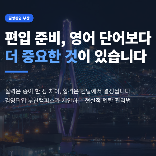 안녕하세요! 김영편입 부산캠퍼스입니다. ⚓ 편입 준비, 영어 단어나 방대한 공부량보다 여러분을 더 괴롭히는 것이 있죠? 바로 '멘탈 관리'입니다. 실제로 많은 수험생이 실력이 부족해서가 아니라, 심리적인 부담감에 먼저 무너지곤 합니다. 오늘은 저희 부산캠퍼스에서 제안하는 편입 수험생을 위한 현실적인 멘탈 관리법을 공유해 드립니다. 1. 편입 준비 중 멘탈이 무너지는 3가지 순간 편입생들이 공통적으로 겪는 고비는 의외로 비슷합니다. 성적 정체기: "공부량은 늘었는데 왜 점수는 제자리일까?" 싶을 때 주변과의 비교: 취업하거나 복학하는 친구들의 SNS를 볼 때 자기 의심: "과연 내가 합격할 수 있을까....... <img src="https://blogthumb.pstatic.net/MjAyNTEyMjZfNjEg/MDAxNzY2NzQ3Mzk0OTU3.0aPQO5NILTqudKeVJsafOeZJWbVrM4wYhplT3ha24h0g.9wzClt3G_rhZQYhXsBAjHLVYJUDlEJ52fQ_6Wah6LOQg.PNG/image.png?type=s3" />