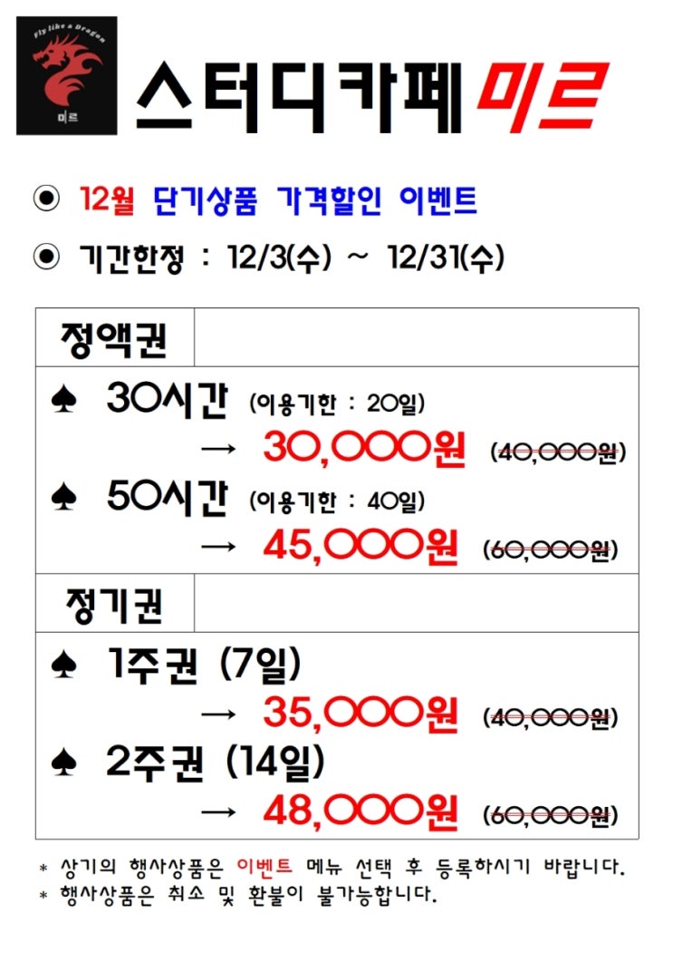 스터디카페미르의 12월 단기상품 할인이벤트 안내입니다. 기말고사를 대비하여 정액권(30시간/50시간)과 정기권(7일/14일) 상품에 대해서 할인된 가격으로 판매하오니 많은 관심 부탁드립니다 <img src="https://blogthumb.pstatic.net/MjAyNTEyMDRfODIg/MDAxNzY0Nzk0NzcyMjAz.ZAHEb_5wA5TdSsRuqHJ9uQ5ETvDbprllL6CaKYqiFzIg.SWvgbM2aBz1KRaFAE9k4HyoXtjd-z2bsISnq5_TxlWIg.JPEG/1764794612232.jpg?type=s3" />