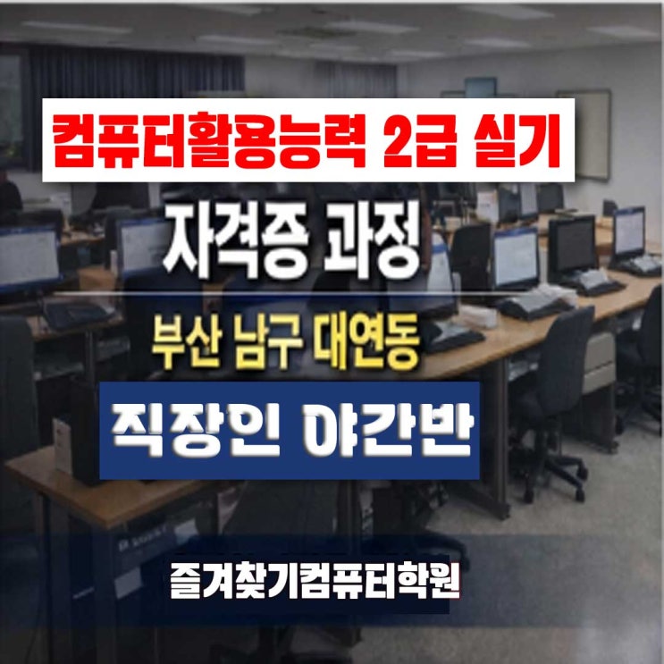 부산 남구 대연동 | 직장인(실업자) 야간반 모집 중 컴퓨터활용능력 2급 실기, 혼자 준비하기 막막하셨다면 지금이 기회입니다. 부산 남구 대연동에 위치한 즐겨찾기컴퓨터학원에서 직장인을 위한 야간 컴퓨터활용능력 2급 실기 자격증 과정을 개강합니다. 컴퓨터활용능력 2급 실기 과정 개요 개강일 : 1월 19일 수업시간 : 오후 7시 00분 ~ 오후 9시 30분 (일 2시간 30분) 수업기간 : 1월 19일 ~ 2월 27일 총 교육시간 : 42시간 (총 16회) 개강과목 : 컴퓨터활용능력 2급 실기 자격증 과정 직장인·재직자·야간 수강생을 위한 맞춤 시간표로 운영됩니다. 이 과정이 특별한 이유 본 과정은 단순한 시험 대비를 넘어, 실제 직장 내....... <img src="https://blogthumb.pstatic.net/MjAyNTEyMjNfMzEg/MDAxNzY2NDcwODkzMzcz.jaaCmVIKhyFJO4HauLJI-Y7knYM-BCKW_GHOa4mBNSYg.iRlBh7j8XpPYJK06kOWzFH9K6pLS4Eg8WK_CCT46HUMg.JPEG/%C4%C4%C8%B0%BD%C7%B1%E21.jpg?type=s3" />