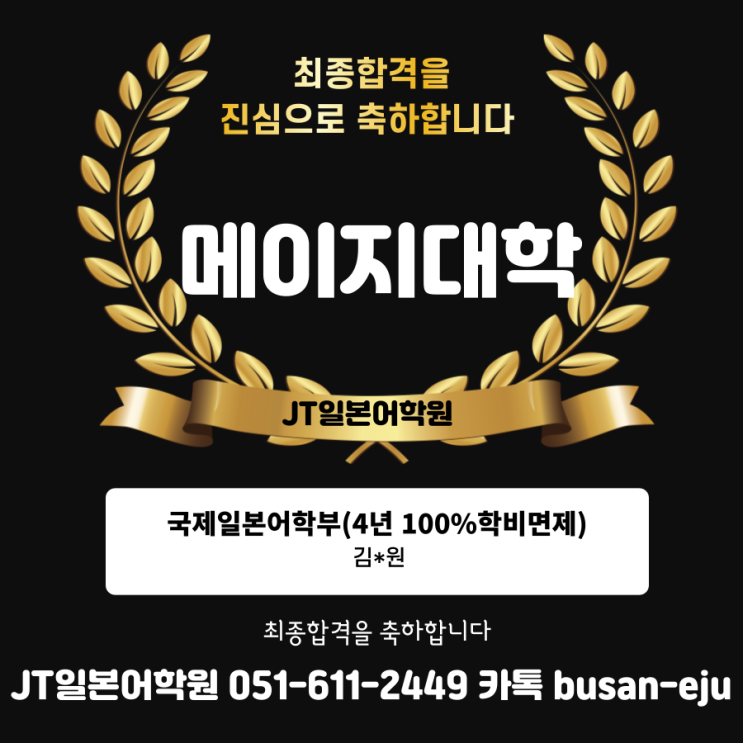 부산EJU(JT일본어학원)~ 메이지대학 국제일본학부 김*원최종합격을 축하합니다~ (4년 100%학비면제)