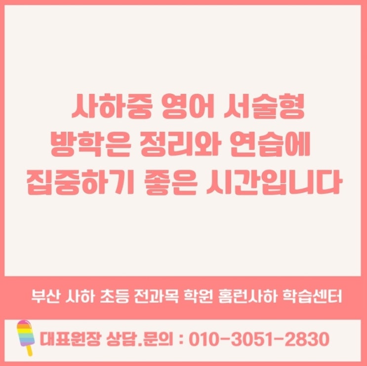 안녕하세요, 사하구 초등중등 수학영어 전문 홈런사하학습센터학원 김은선 원장입니다. 중학생 영어에서 아이들이 가장 많이 막히는 부분은 단어 시험도, 문법 객관식도 아닙니다. 바로 영어 서술형입니다. 뜻은 아는 것 같은데 문장이 안 써지고, 어디서부터 어떻게 시작해야 할지 몰라 빈칸 앞에서 멈춰 서는 아이들. 사하중 학부모님들께서 가장 많이 하시는 고민이 바로 "객관식은 잘 맞는데 서술형에서 점수가 떨어진다"는 것입니다. 이 고민 속에 답이 있습니다. 영어 서술형은 방학에 준비해야 학기 중이 편해집니다. 사하중 영어 서술형 방학은 정리와 연습하기에 집중하기 좋은 시간입니다. 왜 방학에 서술형을 해야 할까요? ....... <img src="https://blogthumb.pstatic.net/MjAyNjAyMDdfMjQ5/MDAxNzcwNDY2MDAyNjg0.WqPmhzd5jVGb9F943ODJItwPbHkQ043CYaNEvxC1hl0g.2kMGGKnWfDyubzx3xGkLhObiMzGn5m5Tv9DrRJRYtJog.JPEG/900%A3%DF1770466002055.jpeg?type=s3" />