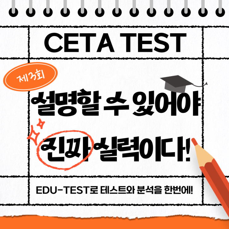 겨울학기동안 열심히 학습한 CETA(Core English Training for Accuracy) 실력을 확인할 수 있는 영어 성취도 평가, 국제어학당 본원 제 3회 CETA TEST가 개최됩니다! 날짜 : 26.02.03(화) ~ 26.02.04(수) 장소 : META ZONE ★CETA TEST란?★ *CETA(Core English Training for Accuracy)는 국제어학당 본원의 정기 Term Test로 1년의 과정동안 두 번 진행됩니다. - 첫 6개월 과정 평가에서는 단어, 서술형, 문법에 중점을 둔 시험이 진행됩니다. - 학기 종료 시점에는 문법, 독해, 듣기, 서술형, 단어 전 영역을 포함해 학생들의 종합적인 영어 실력을 평가합니다. 겨울학기 동안 열심히 공부 한 내용을 바탕으로 본인의 문법 실력을 Test하고 결....... <img src="https://blogthumb.pstatic.net/MjAyNjAyMDRfMjIz/MDAxNzcwMTgxMTc2MDE1.Sqby6UnPRrlbug5kLcRxTPcb_m5W-9-MxZeqFAz1qygg.0WbNkMI7EOdTtIPoF2POIZiEm7R2bAXYNdcQRJ_ypkgg.PNG/%C1%A63%C8%B8-CETA-001_%281%29.png?type=s3" />