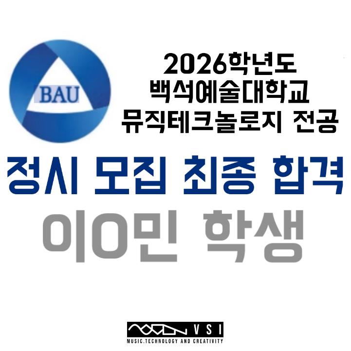 안녕하세요! 부산 미디 작곡 전문 학원 VSI 뮤직테크놀로지 학원입니다 ☺️ 2026학년도 백석예술대학교 뮤직테크놀로지 전공 이O민 학생의 정시 모집 최종 합격 소식 입니다! 끊임없이 노력한 학생에게 진심으로 축하의 박수를 전합니다 전자음악/미디작곡 입시는 VSI 1:1 전공별 맞춤 수업 (DAW / 화성학 / 피아노 / 사운드 메이킹) EMS 수업을 통한 주간 입시곡 제작 과제 (작업일지 작성 / 면접대비 대답 요령) 실전처럼 구성된 면접 모의고사 & 초견 대비반 운영 합격생 피드백 기반 예측 질문 리스트 제공 온라인/오프라인 병행 수업으로 유연한 학습 환경 제공 각 대학의 출제 방향과 실전 환경에....... <img src="https://blogthumb.pstatic.net/MjAyNjAyMDRfNDgg/MDAxNzcwMTkxNTgxNDQy.WASNv3QUJFt2XLFf_F7S3kyherhVYegXPW5hyVpdDqIg.wsWubuKQm-QsEwsptuJemtgqMNjeonxT5NQKZI3TT9Yg.PNG/3333.png?type=s3" />
