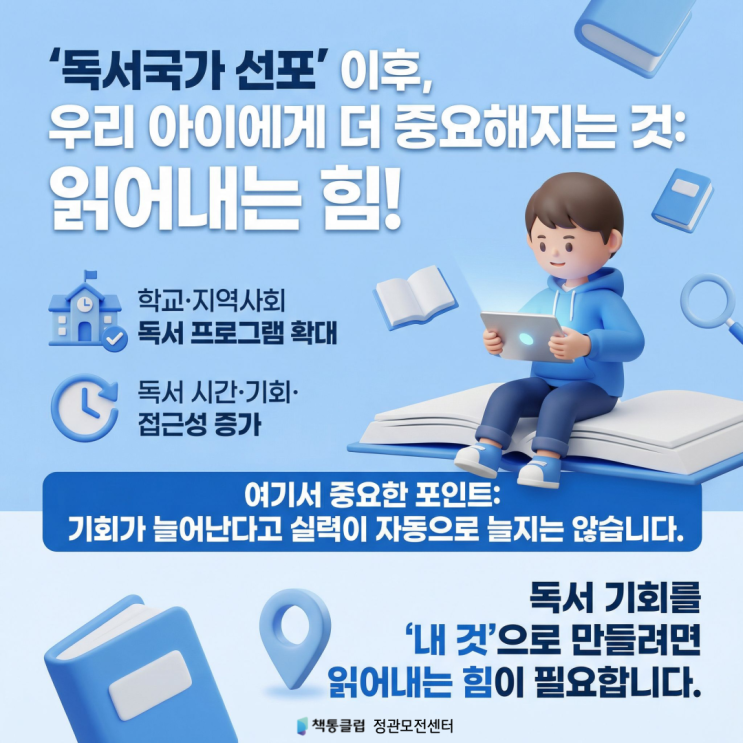 [정관독서논술]독서국가 선포, "기회를 내것으로 만드는 읽는 힘" 독서국가 선포, ‘독서 기회’는 확장됩니다. 그래서 더 중요해지는 건 “내 것으로 만드는 읽는 힘” 입니다!!!^^ 안녕하세요. 정관모전센터 책통클럽입니다.^^ 최근 ‘독서국가 선포’ 소식 이후, 독서가 국가 차원의 과제로 다시 강조되기 시작했습니다. 이 흐름이 계속된다면 앞으로는 지금보다 더 많은 아이들이 ✔ 책을 읽을 시간 ✔ 독서 활동의 기회 ✔ 도서 접근 환경 (학교·지역사회·공공 인프라) 을 이전보다 더 쉽게, 더 자주 만나게 될 가능성이 큽니다. 이 변화는 분명 반가운 소식입니다.^^ 하지만 동시에, 여기서 한 가지 중요한 질문이 생깁니다. “....... <img src="https://blogthumb.pstatic.net/MjAyNjAyMTBfMTMg/MDAxNzcwNzExNTkyMjgx.dpCNLjdbvD1eotP7Z7rCSeuAsS_5g46fFbe0ohh7Vckg.6-YUqzo8_r6ETPEl63w_bjdawe8f3L0rdqyzM7ZnNE4g.PNG/%C1%A6%B8%F1%C0%BB-%C0%D4%B7%C2%C7%D8%C1%D6%BC%BC%BF%E4_-001_%287%29.png?type=s3" />