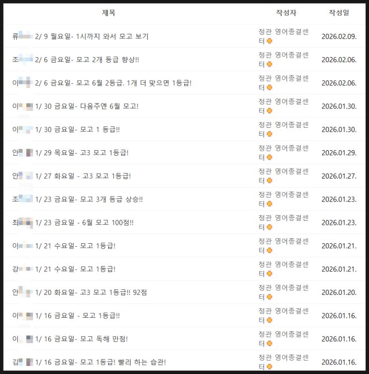 정관의 학부모님들, 안녕하세요. 요즘 달력을 보면 참 마음이 복잡하시죠? 유난히 춥고 길게만 느껴졌던 겨울방학도 이제 끝자락에 다다랐습니다. 방학이 시작될 때만 해도 "이번에는 꼭 부족한 문법을 잡아야지", "기초를 탄탄히 다져서 다음 학기에는 성적 좀 올려보자"며 아이와 함께 굳게 다짐하셨을 텐데, 막상 지금 우리 아이의 모습을 보면 어떤 생각이 드시나요? 여전히 영어 책 펴는 걸 힘들어하고, 문법 문제만 나오면 한숨부터 내쉬는 아이를 보며 '이 소중한 시간을 그냥 흘려보낸 건 아닐까' 걱정되는 게 솔직한 부모님의 마음일 겁니다. 하지만 같은 시간, 영어종결센터 정관지점의 학생들은 조금 다....... <img src="https://blogthumb.pstatic.net/MjAyNjAyMTJfMjQg/MDAxNzcwODc0MjEwMTg0.-ABws3tOBbX8UkLRfnjc1dXy2kInJvoTKNEpIouVHGkg.N5qPes0YjNJEw8WpyB2-ag0ORLVE1kHtFrdhHnoe4ecg.PNG/momo.png?type=s3" />