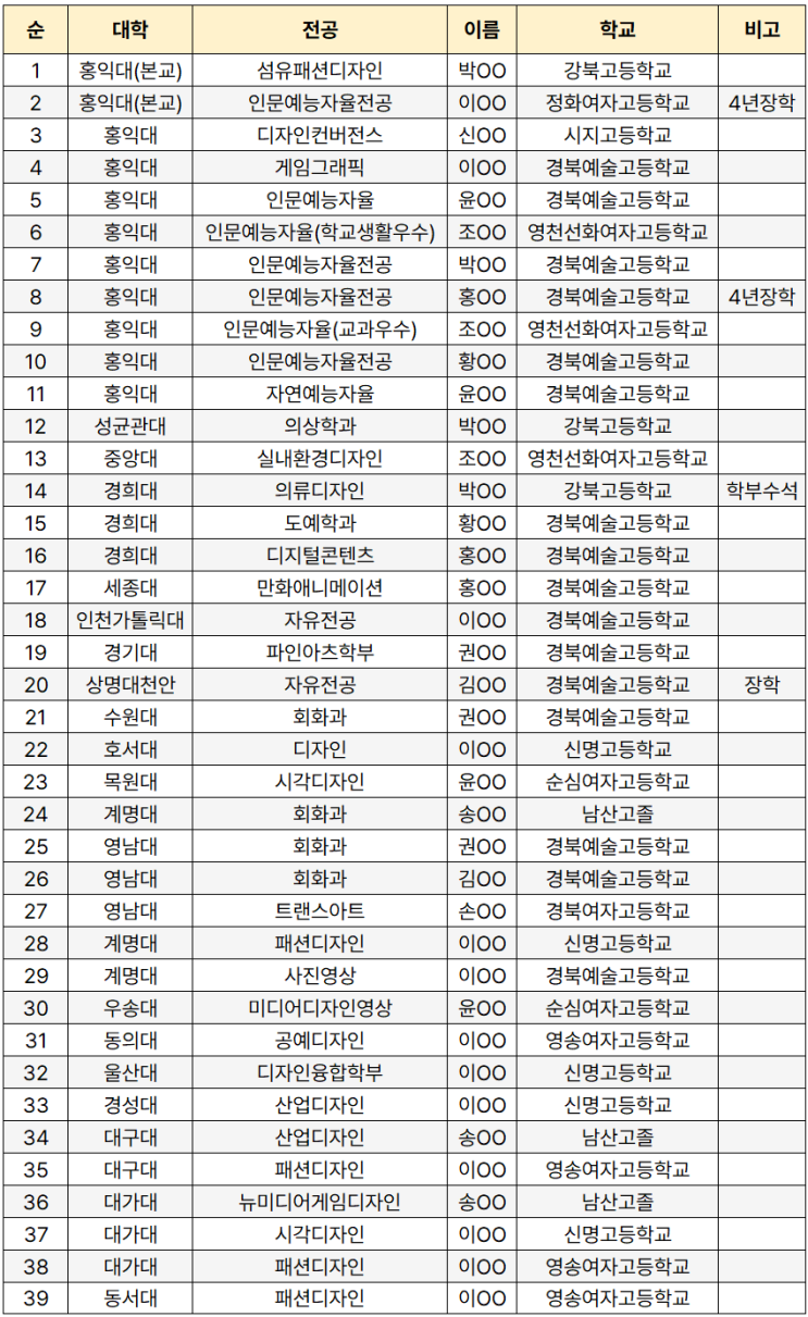 안녕하세요 대구틴트미술학원입니다. 26학년도 미대 수시 입시가 마무리되며, 올 해 결과를 정리하면서 한 가지 분명하게 느낀 점이 잇습니다. 단순히 그림을 잘 그리는 학생만이 합격한 것이 아니라, 각 학생에게 맞는 방향과 전략을 정확히 선택했는가가 결과를 가른 입시였다는 점입니다. 올해 틴트미술학원에서는 전형도, 출발선도, 준비 기간도 서로 달랐던 학생들이 각자의 방식으로 의미 있는 결과를 만들어냈습니다. 누군가는 짧은 준비 기간 속에서도 선택과 집중 전략으로 물리적 시간을 뛰어넘어 실기 5관왕을 달성하기도, 또는 과감한 노선 변경을 통해 기대하지 않았던 성취를 이루기도 하였습니다. 이번 글에서는 인상적인 합격 사....... <img src="https://blogthumb.pstatic.net/MjAyNTEyMTdfMSAg/MDAxNzY1OTM2Mzc5OTMz.YFPFnnyPZtq1gUObAWk5gNs9OnuvgHYm1j-sWewDbv0g.BshZv57HR-0D2xfa7VsNs0Vt0Rbd-qStfAQ9QscldTQg.PNG/image.png?type=s3" />