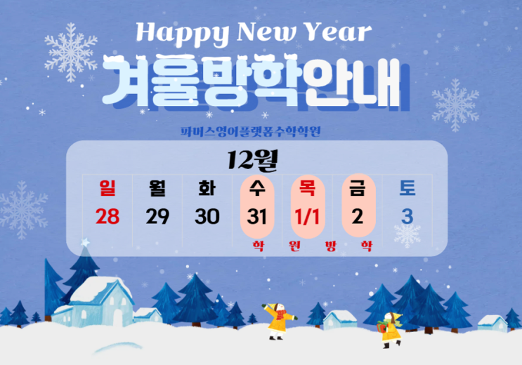 안녕하세요, #평리동파머스영어플랫폼수학학원 입니다 ❤️❤️❤️ #겨울방학기간 #안내 포스팅 입니다 날짜 잘 확인하시어 착오 없기 바랍니다 ⭐️☃️ - 언제든지 문의 주세요! 053-551-3911 #평리동영어 #평리동초등영어 #평리동초등전문영어 #유아영어 #평리동유아영어 #평리동파닉스 #수학 #오해 #정승제 #사고력 #평리동수학 #초등 #중등 #고등 #사고력수학 #문해력수학 #오창영논술수학 #다비수 #서구 #영어 #초등선행 #중등선행 #고등선행 #대구다비수 #대구오창영 #서구다비수 #평리동다비수 #논리적사고 #교육 #창의적문제 #여름방학 #겨울방학 #영어맛집 <img src="https://blogthumb.pstatic.net/MjAyNTEyMTVfMTQ4/MDAxNzY1NzY4NTMzNTIy.P1mPWm4ZwzHoEH2PvKOEu2BsYOAPwHXUUol3mt-tkRog.KxODnB2qm-iOJt2BuIhH4VcQVTdKEvDLQUtQr1m6KoUg.PNG/IMG%A3%DF9489.PNG?type=s3" />