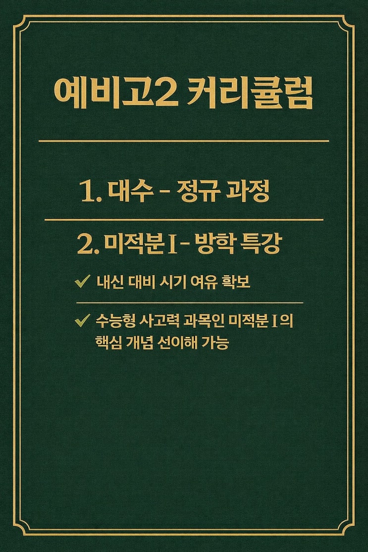 예비고2 커리큘럼 안내 ― 대수(정규과정) + 방학 중 미적분Ⅰ 특강 안내 ― 예비고2 시기는 고등 수학의 난이도와 과목 수가 크게 늘어나면서 학습부담이 확연히 커지는 학년입니다. 특히 고2부터는 대수, 미적분Ⅰ, 확률과 통계 여기에 학교와 학생 선택에 따라 미적분Ⅱ까지 총 3~4과목의 성적을 동시에 관리해야 하는 학년이 됩니다. 이 때문에 2학기부터 수학 부담이 급증하며, 내용 간 연계도 강해 기초를 먼저 잡아두는 것이 매우 중요합니다. 1. 그래서, 왜 방학 중 미적분Ⅰ 학습이 필요한가? 미적분Ⅰ은 고2 과정 중 난이도·범위 모두 가장 큰 축을 차지하는 핵심 과목입니다. 대수 또는 확통을 병행해야 하는 학기 중....... <img src="https://blogthumb.pstatic.net/MjAyNTEyMjNfMjYw/MDAxNzY2NDcwODgxNjE4.KWv9o0wDzo9frl_GYC3JSYsehwRdfHTgq_u5D8PwX9cg.6DS_AVywAkd3xJYX_BHtM6gL11D3mJ-YBZmVoLaC8B0g.JPEG/%BF%B9%BA%F1%B0%ED2%C4%BF%B8%AE%C5%A7%B7%B3.jpg?type=s3" />