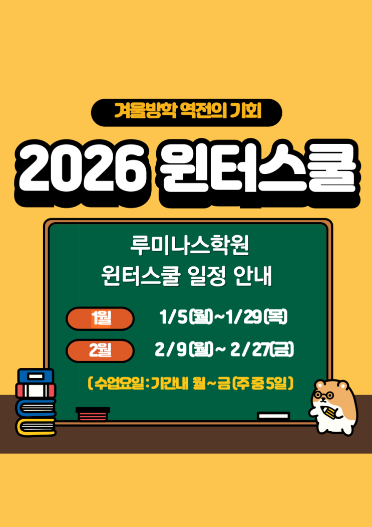 겨울 방학은 역전 할 수 있는 최고의 기회입니다. 2026 루미나스 윈터스쿨 프로그램은 개인의 진도에 맞게 집중 진행하는 개별진도 수업과 10명이내 소수 정원이 판서식 수업 + 개별 첨삭으로 이뤄지는 소수 단과 수업으로 이뤄집니다. 루미나스학원이 만든 윈터 특별 프로그램은 2026 수학 성적 향상과 실력 향상을 만듭니다. <img src="https://blogthumb.pstatic.net/MjAyNTEyMTBfMjY2/MDAxNzY1MzUxMDczNDE5.4ZjhaO2iW0FNJnqJC36rNHIYnRgDZE9KOvN5aPh-R5og.gUqb4dVcScriHWCtdz3oouy8ZatxqmZh7qHXktDIadwg.PNG/%C0%A9%C5%CD2.png?type=s3" />