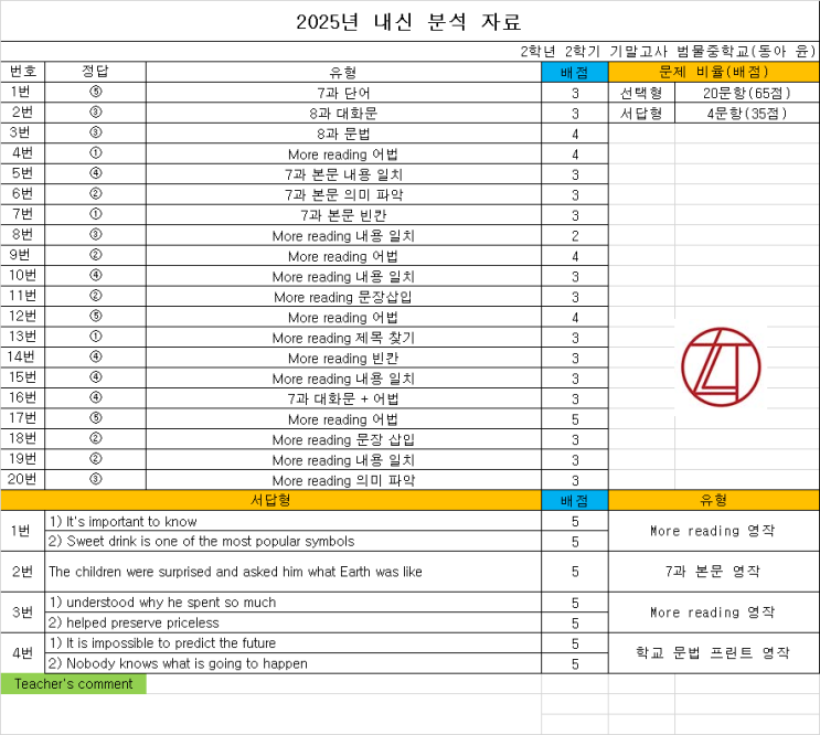 [범물동영어학원] 2025년 범물중 2학년 2학기 영어 내신 기말고사(feat.로켓분석)