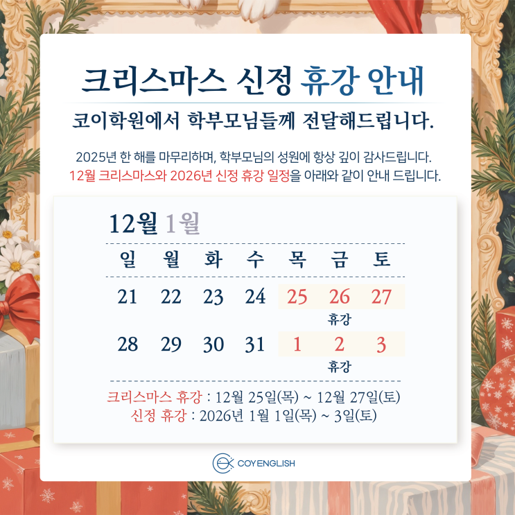 대구만촌동영어학원 12월 크리스마스 및 1월 신정 휴강 안내 소식을 전해드립니다. 안녕하세요, 대구만촌동영어학원 '코이영어학원'입니다. 2025년 한 해를 마무리하며, 학부모님의 성원에 항상 깊이 감사드립니다. 오늘 코이영어에서는 다가오는 크리스마스와 2026년 신정으로 인한 휴강 일정을 아래와 같이 안내 드립니다. 12월 크리스마스, 1월 신정 휴강 안내 코이영어학원에서 학부모님들께 전달해 드립니다. 12월과 1월 휴강 일정과 관련하여 아래와 같이 휴강을 진행하오니 참고 부탁드립니다. □ 휴강 안내 ※ 크리스마스 휴강 : 12월 25일(목) ~ 12월 27일(토) 휴강 ※ 신정 휴강 : 2026년 1월 1일(목) ~ 1월 3일(토) 휴강 □....... <img src="https://blogthumb.pstatic.net/MjAyNTEyMTlfMjQg/MDAxNzY2MTQ0MDU1NTI2.ZrO2VzKc8DWmMKJfc45O7qvXq_IWGmb2ky7_hsvSt7wg.atJWqsQoIOXLlbKR1UeClFNqLv957zaWo2-HCdEzH3Ug.PNG/%BC%B3%BF%AC%C8%DE%C8%DE%B0%AD2_%BB%E7%BA%BB.png?type=s3" />