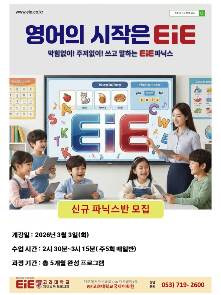 EiE 고려대학교 국제어학원 신규 파닉스반 1차 마감 · 2차 개강 안내 안녕하세요 EiE고려대학교국제어학원 대구 유천캠퍼스입니다. 많은 학부모님들의 관심과 성원 덕분에 신규 파닉스반 1차 개강이 조기 마감되었습니다. 보내주신 문의와 대기 요청이 이어져 3월에 신규 파닉스반 2차 개강을 진행하게 되었습니다. ✨ 왜 EiE 파닉스일까요? 영어를 처음 시작하는 시기, 가장 중요한 것은 기초와 자신감입니다. EiE 파닉스 수업은 알파벳 소리부터 단어 읽기까지 차근차근 읽기 · 쓰기 · 말하기를 함께 익히며 아이가 영어를 공부가 아닌 언어로 받아들이도록 도와주는 체계적인 프로그램입니다. 수업 시간에는 아이들이 자연스럽게 소....... <img src="https://blogthumb.pstatic.net/MjAyNjAxMzFfODIg/MDAxNzY5ODAwMzM4NjI3.s9s9fjMGpwRwoxQ6HR_N2-OwwDyJfdx6IaOpFCTrN-8g.JosXAZ-iX2iLekr33kiwGgRIwKKLP31BiW4ayPoZxGUg.JPEG/900%A3%DF1768479513993.jpg?type=s3" />