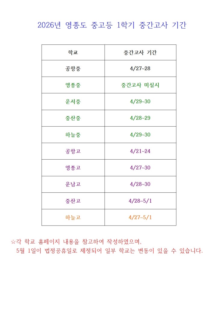 2026년 영종도 중고등 1학기 중간고사 기간