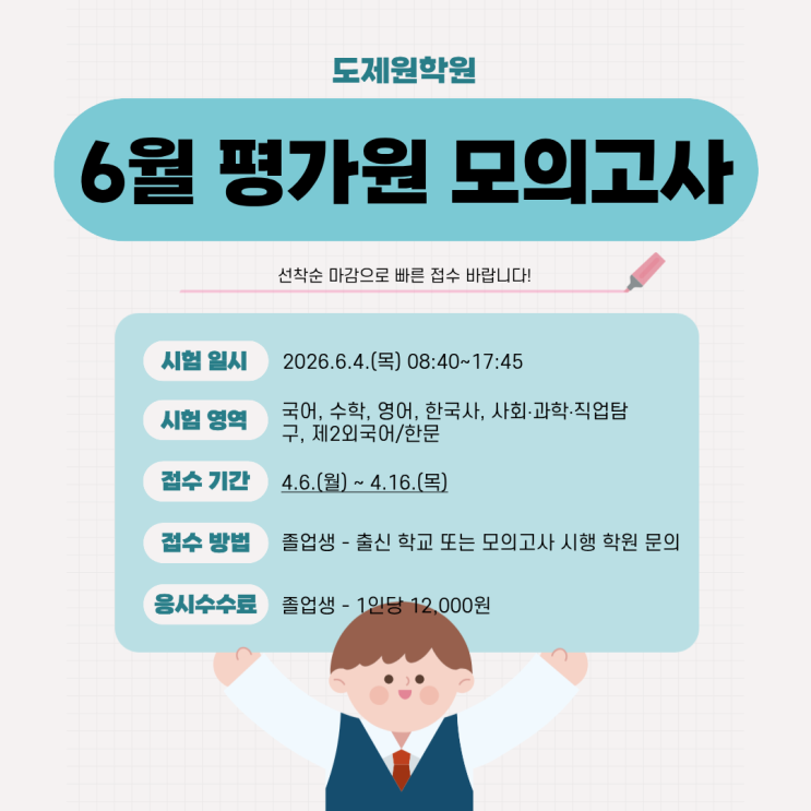 안녕하세요. 도제원 구월캠퍼스입니다. 6월 한국교육과정평가원 시행 모의고사 접수 기간이 다가왔습니다. 재수생 여러분께서는 신청 기간을 놓치지 않도록 미리 확인하시기 바랍니다. 시험 일시 2026.06.04.(목) 08:40~17:45 시험 영역 국어, 수학, 영어, 한국사, 사회‧과학‧직업탐구, 제2외국어/한문 접수 기간 2026.04.06(월)~04.16.(목) 접수 방법 출신 학교 또는 모의고사 시행 학원으로 직접 문의 응시수수료 1인당 12,000원 접수는 선착순 마감이므로 접수 기간 첫날 모두 접수 바랍니다! 주소 인천 남동구 인주대로 580 동남빌딩 5층 (인천1호선 예술회관역 3번출구) 문의 032-721-5609 상담가능시간....... <img src="https://blogthumb.pstatic.net/MjAyNjA0MDNfMTAz/MDAxNzc1MTc2NDQ1MTIw.1kDgP5zxmZ9CSdFXayt6c9ASZk1SQbFtarh7Nh5GA30g.NB8gilkBp9hw_inOUP-q2lupnf2mCxiRGS-Hdu3mxSMg.PNG/%B1%B8%BF%F9_%284%29.png?type=s3" />
