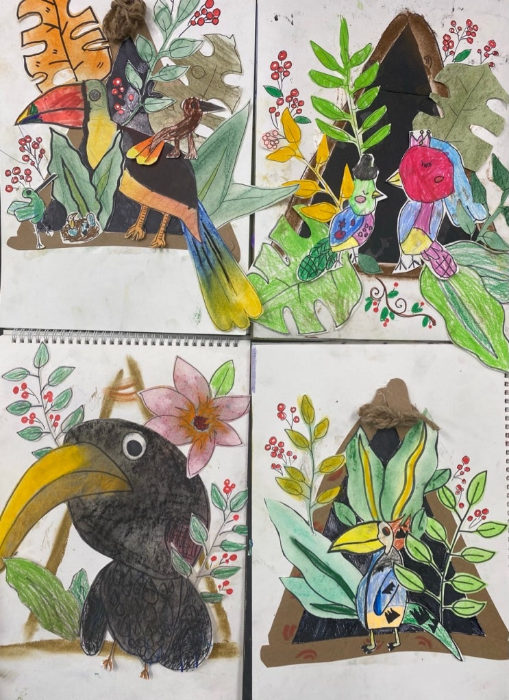 트로피칼 버즈를 주제로 친구들이 열대우림에서 볼 수 있는 새를 그리고 다양한 잎으로 꾸며 보았어요~