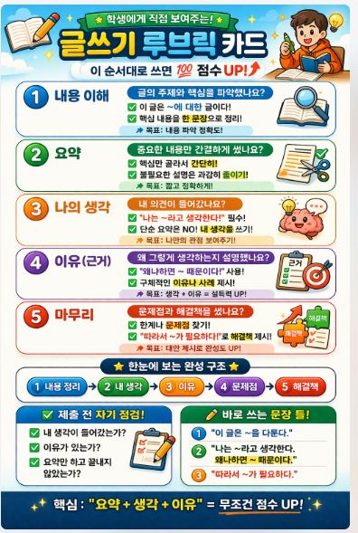 전체 구조 한눈에 보기 ▶▶▶ 글쓰기 실력은 한 번에 완성되지 않습니다. 다음과 같은 4단계 성장 구조로 접근하는 것이 가장 효과적입니다. 1단계: 읽고 이해하기 2단계: 정리하고 요약하기 3단계: 생각 만들기 4단계: 논리적으로 표현하기 1단계 (중1) “읽고 이해하는 힘 만들기” 목표 글의 핵심 내용 파악 중심 생각 찾기 훈련 방법 →★ 하루 1지문 읽기 →★ 다음 질문에 답하기 이 글은 무엇에 대한 글인가? 가장 중요한 문장은 무엇인가? 훈련 예시 →★ “이 글의 핵심은 ~이다. 왜냐하면 ~ 때문이다.” 핵심 포인트 아직 ‘잘 쓰는 것’보다 →★ “정확히 이해하는 것”이 더 중요 2단계 (중2) “요약과 정리 능력 키우기” 목표 →....... <img src="https://blogthumb.pstatic.net/MjAyNjAzMjNfMTEw/MDAxNzc0MjUxNjQ5ODc3.RmseOa74vGToq3mEaFPKThSAL_-yMbc6ByXrhh3Tq1wg.vRh2qtmI89_V_ORDnR2QEIp4g6QNw96iEpxnkzyYwogg.JPEG/%C4%B8%C3%B3.JPG?type=s3" />