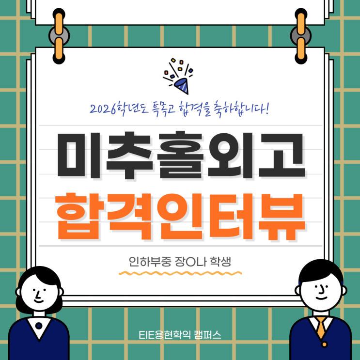 안녕하세요. 용현동 영어학원 EIE 고려대학교 국제어학원 용현학익 캠퍼스입니다. 띵동-! 특목고 합격자 인터뷰가 도착했습니다! 오늘 만나볼 주인공은 미추홀외고 중국어과 최종 합격생이에요. 인천에서 특목고를 준비하는 친구들, 어디서부터 어떻게 해야할지 고민이 많죠? 오늘은 선배의 찐후기를 통해서 실제 면접에서 어떤 질문을 받았는지, 또 어떻게 준비했는지 알짜배기 정보를 꼭 알아가세요! 자소서 쓸 때 도움받았던 방법부터 두괄식 말하기 연습 팁, 미추홀외고 면접 질문과 그에 대한 답변까지! EiE가 왜 특목고 합격률 높은지, 이 글 하나만 읽어봐도 감이 오실 거예요. 우리 학원의 준비 시스템과 학생의 집중력은 결국 결과....... <img src="https://blogthumb.pstatic.net/MjAyNjAxMjhfMTA5/MDAxNzY5NTI4NjUwNzc5.zA0GSDauRI1Ix56U-XNmrKmZPq-5fyciwlpHvzDj-uUg.lLuS7MoQrh6c7EQL_hbXUNW0IzGZqyPLEQr3Wo_quL4g.PNG/006.png?type=s3" />