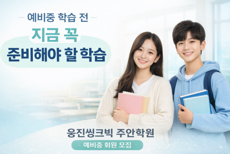 안녕하세요 웅진씽크빅 김팀장입니다 예비중 학부모님들~ 곧 우리아이 중학교 입학이네요 축하드려요~ 교복 맞추고 뭔가 준비해줘야 할거 같은데 잘하고 있는지 궁금하시죠? 중학교 입학을 준비하는 예비중 학부모님들의 고민은 비슷합니다. “ 벌써 중학교 공부를 해야 할까요?” “선행보다 중요한 게 뭘까요?” 사실 중학교 입학 전 학습의 핵심은 ‘선행’이 아니라 ‘기초 정리와 학습 습관’입니다. 이 시기를 어떻게 준비하느냐에 따라 중1 성적의 방향이 결정됩니다. ※ 예비중 입학 전 학습, 왜 중요할까? 중학교는 초등과 완전히 다른 학습 환경입니다. ✔ 과목별 난이도 급상승 ✔ 시험 중심 평가 체계 ✔ 자기주도 학습 능력 필수 특....... <img src="https://blogthumb.pstatic.net/MjAyNjAxMjhfMTk5/MDAxNzY5NjA1NTk3OTAy.9E8zPTVJhjd2FPurnUEWcl2GUYGRl7I-UXLobOPDWSog.cKEw6kyZRZvK8KqJ5ZB9eVV_TynQnXSFbWcATcvqFRMg.PNG/image.png?type=s3" />