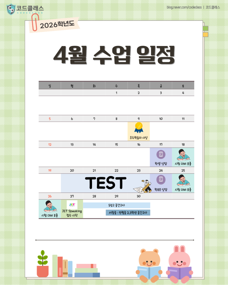 <서창동 소수정예 영어수학>[코드클래스] 2026년 4월 학원 일정 안내