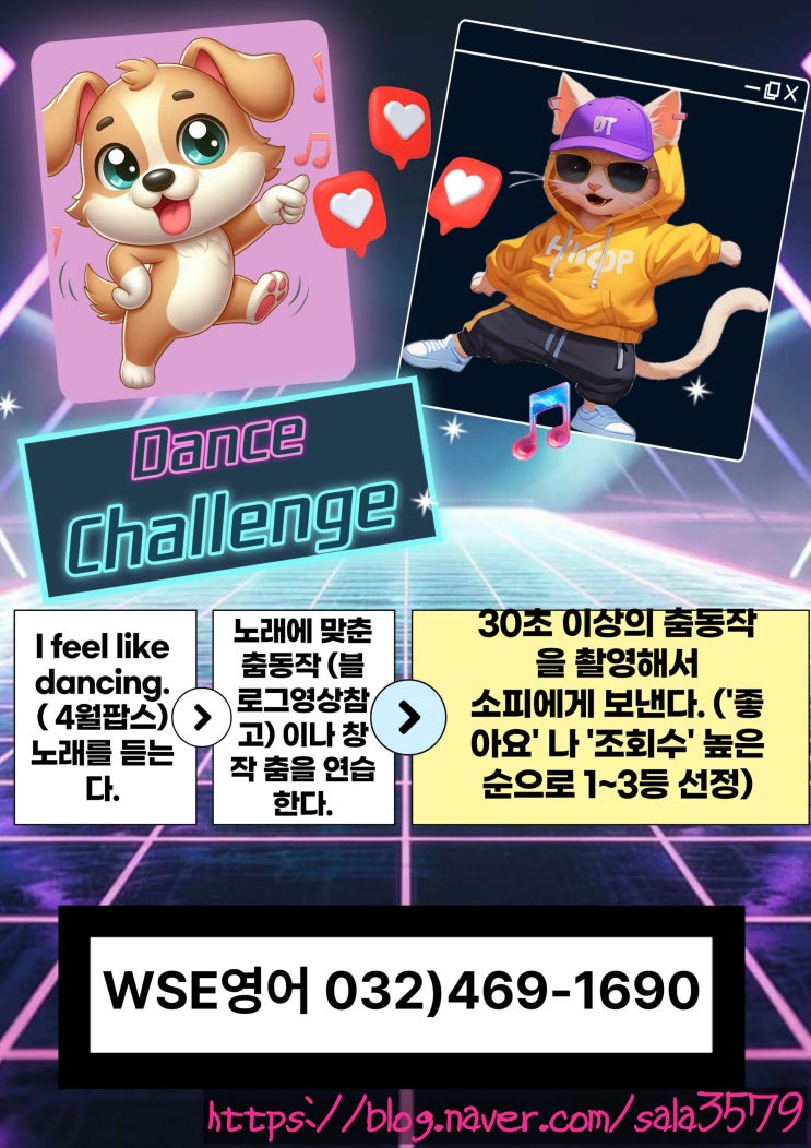 햇살 따스하지만 바람은 찬~~4월입니다. 어느새 꽃들이 피기 시작합니다. 저희는 5월에 마 켓 데 이 가 있기 때문에~~~ 4월 팝스를 잘 듣고~ 춤동작을 따라하거나~~ 창작을 한 후 30초 이상의 영상을 촬영해서 소피에게 보내면 됩니다. 그러면 업데이를 해서 '좋아요~'나 '조회수~'가 높은 순으로 1-3등 순위가 정해집니다. 많은 관심 부탁해요~~ 도움이 될 만한 영상들 올려봅니다. https://youtu.be/7g9D5bijjJI?si=eUMEQjfnhu3SFQ-x https://youtu.be/tSNLY2MbGM4?si=lvlkQQWq11YyMwrp https://youtu.be/qmYG-qG1fD0?si=Q1dMvtJDp6u2toRC https://youtu.be/TZ3hmlCEbYU?si=UXHIqyavOf1fiOIZ <img src="https://blogthumb.pstatic.net/MjAyNjA0MDJfNTgg/MDAxNzc1MTI1MTAwNjg3.jsPk15g8m8WnchcxSEyAvKcB5Jz9NmDC394gX-wf7eQg.84rBw6GojBYdPDZxSNnJFg4SX8ar0QJXShFa0Ak3Pjcg.JPEG/%B4%ED%BD%BA%C3%A7%B8%B0%C1%F6.jpg?type=s3" />