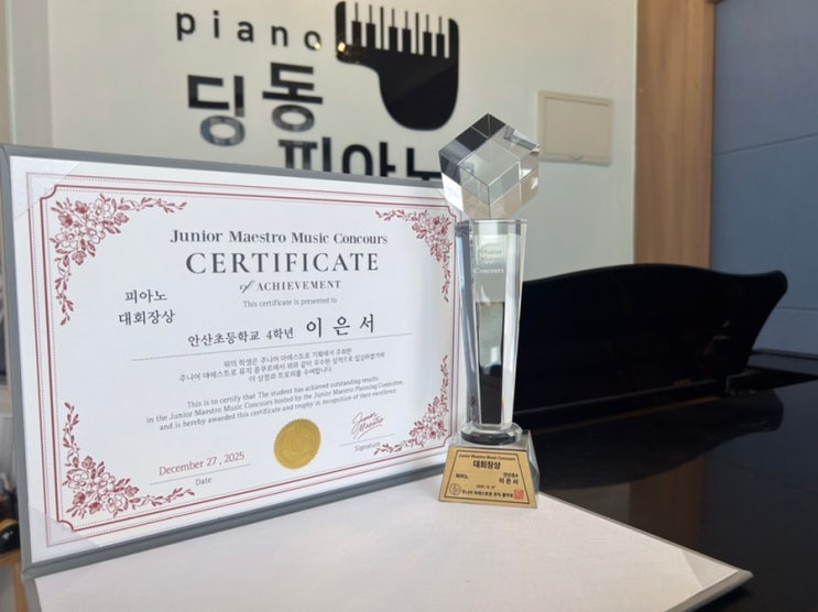 안녕하세요! 딩동피아노의 딩동쌤입니다❤️ 92점, 그리고 아이들의 환한 웃음 콩쿨을 다녀왔습니다. 결과는 92점. 숫자도 참 고맙지만, 그보다 더 행복했던건, 상장과 트로피를 어제 받아 들고 아이들이 지었던 그 환한 웃음이었어요. “와!” 하면서 눈이 반짝이던 순간, 기쁨을 숨기지 못하고 웃음이 터져 나오던 모습에 오히려 제가 더 뿌듯하고 행복해졌습니다. 콩쿨이라는 무대가 결과를 평가받는 자리이기도 하지만, 아이들에게는 도전해 보고, 해냈다는 자신감을 느끼는 시간이라는 걸 다시 한번 느끼게 된 하루였어요. 무엇보다도 “또 콩쿨 나가고 싶어요!” 라고 말해주는 아이들의 한마디가 참 고마웠습니다. 그래, 또 한 번 도전해....... <img src="https://blogthumb.pstatic.net/MjAyNjAxMjlfMTIx/MDAxNzY5NjU1Mjk0MTc2.OBpZ7SvFDfh1vuFDNAReKD7aO-8KW0uMaHQ1esvDJeQg.mWFnAqPsc1NXD3ANRnZ-KdJFV0UvvmnXxUpJMeXLtyQg.JPEG/IMG%A3%DF7423.jpg?type=s3" />