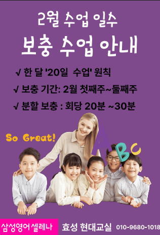 2월 수업 일수 '보충 수업' 안내 안녕하세요! 삼성영어 효성현대교실입니다:) 저희 학원은 매월 '20일 수업'을 원칙으로 운영하고 있습니다. 다만 2월은 설날 연휴로 인해 수업일수가 3일 부족하여 '보충 수업'을 진행하고자 합니다. 이에 따라 2월 '첫째 주'와 '둘째 주'에 정규 수업 시간에 비례하여 회당 20~30분 내 '분할 보충 수업'을 진행할 예정이오니 학부모님의 양해 부탁드립니다. 앞으로도 수업 운영에 차질이 없도록 최선을 다하겠습니다. 항상 믿고 맡겨주셔서 감사합니다. 삼성영어 효성현대교실 드림 <img src="https://blogthumb.pstatic.net/MjAyNjAyMDFfMjk2/MDAxNzY5OTI4MjkxMDc0.uZbllwFJNDLCRvFGl4BZpgVWo15LjmBKQ42BmYlzBz0g.4Xv81xSUuQYSXZLhb6KeABggkMluLzSuBQoZvw-Uqegg.PNG/2%BF%F9%BC%F6%BE%F7%C0%CF%BC%F6%BA%B8%C3%D1%B0%F8%B9%AE_-_%BA%B9%BB%E7%BA%BB.pdf.png?type=s3" />