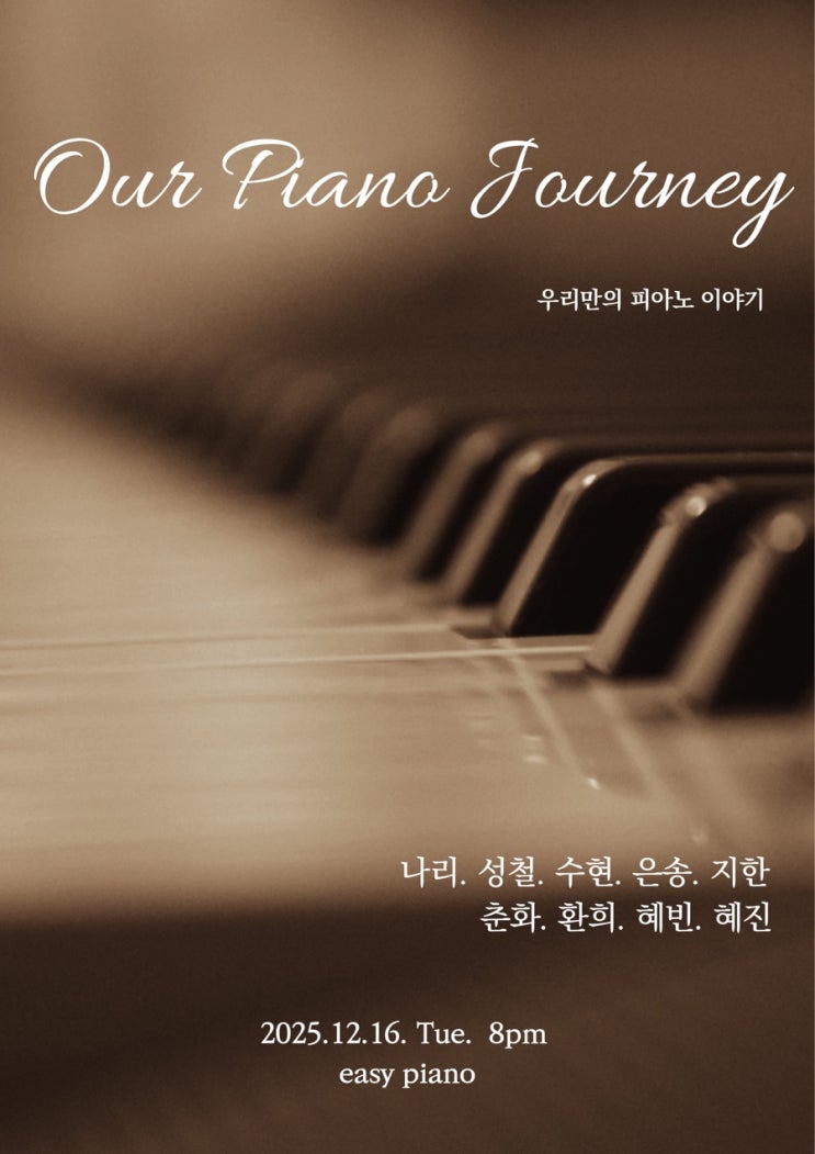 한 해를 마무리하던 지난 12월, 이지피아노에서는 아주 특별한 시간이 열렸습니다. 거창한 무대는 아니지만, 연습실의 온기가 그대로 남아있는 우리만의 공간에서 열린 '우리만의 피아노 이야기' 연주회였습니다. 화려한 드레스가 아닌 편안한 일상복을 입고, 긴장된 마음을 서로 다독이며 시작했던 우리만의 특별한 무대였습니다. 연주를 시작하기 전, 수강생 한 분 한 분의 이름을 부르며 아주 특별한 전달식을 가졌습니다. 그간의 피아노의 이야기 그리고, 앞으로의 이야기가 담긴 ... 원장인 제가 직접 문구와 내용을 고민하여 제작한 '세상에 단 하나뿐이 맞춤형 상장' 수여식이었습니다. 상장에 적힌 문구 하나하나를....... <img src="https://blogthumb.pstatic.net/MjAyNjAyMDRfNzcg/MDAxNzcwMjE1MTc3NDMy.VUzKxdMo-Pp6WPZf0DOmbR8RazhONXbPqWeYiu0gdUIg.lZK5GOa_wUxvs_GLG5Phw0yp-6nZvaOFAFXKVpUAQA8g.JPEG/%C7%C7%BE%C6%B3%EB_%B0%A5%BB%F6_%B9%E8%B0%E6_%B0%A1%C0%BB_%C5%AC%B7%A1%BD%C4_%C4%DC%BC%AD%C6%AE_%C6%F7%BD%BA%C5%CD.jpg?type=s3" />