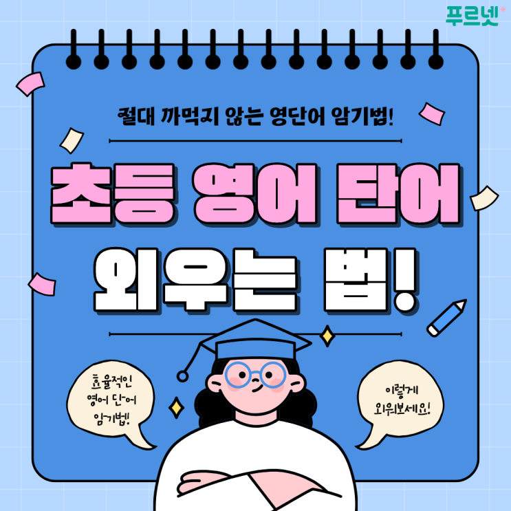 안녕하세요. 푸르넷입니다! 영어 공부의 기본은 단어 암기이죠! 하지만 잘못된 방법으로 단어를 외우면 금방 잊어버리기 쉬워요. “많이” 외우는 것에만 집중하여 “어떻게” 외워야 하는지를 고려하지 않아 며칠 안에 대부분 잊어버리곤 하죠. 지금부터 영어 단어를 어떻게 외워야 하는지 효율적인 영어 단어 암기법에 대해 소개해 드릴게요! 1. 주제별로 묶어서 외우기 많은 단어들을 무작위로 외우는 것보다 하나의 주제로 묶어서 외우는 것이 효과적이에요. 같은 주제의 단어들이 일으키는 ‘연상 작용’으로 인해 높은 암기 효과를 경험할 수 있답니다! 동물, 감정, 학교생활, 날씨 등 아이들에게 친숙한 주제로 단어장을 구성하여 외워보....... <img src="https://blogthumb.pstatic.net/MjAyNjAyMDVfMjQg/MDAxNzcwMjUzODUyMTQ0.cNWhwY5ZhPFrbtHryzBdwnDWT9jlz3gXQGHiqqQJCjIg.oSwaxklPVA_dDcT340i0e5tpQQ-qBxifAB_CchMt2B4g.PNG/%BA%ED%B7%CE%B1%D7%BF%EB_%BD%E6%B3%D7%C0%CF.png?type=s3" />