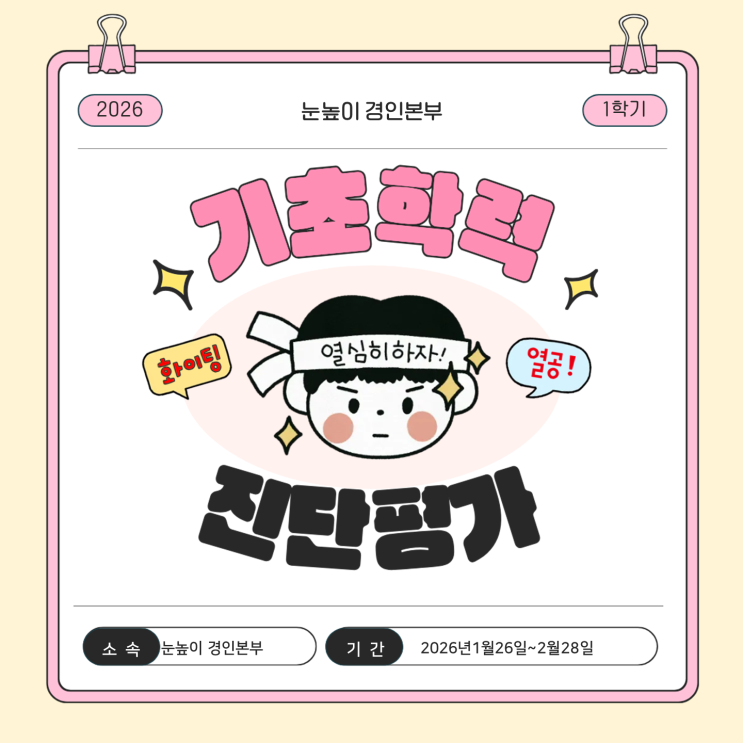 안녕하세요 눈높이 경인본부 입니다:) 새학년을 앞두고 학부모님들이 가장 많이 하시는 고민이 있습니다. “우리 아이, 지금 학년 공부는 제대로 따라가고 있는 걸까?” “선행을 해야 할지, 복습을 먼저 해야 할지 모르겠어요.” 이럴 때 가장 먼저 필요한 것은 바로 추측이 아닌 ‘객관적인 점검’! 그래서 많은 학부모님들이 선택하는 것이 바로 기초학력평가입니다. 기초학력평가란 무엇인가요? 기초학력평가는 ✔ 지금 학년에서 꼭 알아야 할 핵심 기초가 잘 갖춰져 있는지 ✔ 과목별로 어디에서 이해가 막히는지 를 확인하는 기초 진단용 평가입니다. 대교에서 시행하는 전국학력진단 기초학력평가의 장점은?! 전국 단위 기준으로 실력을 점....... <img src="https://blogthumb.pstatic.net/MjAyNjAyMDVfNzMg/MDAxNzcwMjc5Mzg5MDky.kJIyQo90yLh-AiJVsssGnSOosNg5AL1EUj9D26mZ2OIg.9IDdvrF0R7t9HFlcCrhxI4r8d3vqSJDtVD192u06Yakg.PNG/%BD%BD%B6%F3%C0%CC%B5%E51.PNG?type=s3" />