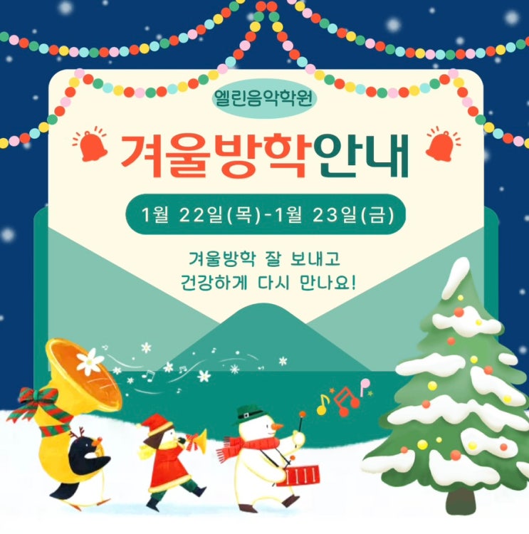 안녕하세요 엘린음악학원입니다. 엘린음악학원 겨울방학 안내❄️☃️ 1월 22일(목)~23일까지(금) (2일간) ☑️ 1월 26일 월요일에 만나요 ⏰방학 운영시간 : 11:30 - 5:30 상 담 문 의 : 010.4728.0537 <img src="https://blogthumb.pstatic.net/MjAyNjAxMjBfMTAw/MDAxNzY4OTA1NTM0OTA0.PoFDNbXxMlA8uQl4T_7xtPAjMXXqP0oWWa8gmEHprzkg.syHazsYOtI03H9RAYnB33Mz088absTbQiX_-J4MeuXsg.JPEG/IMG%A3%DF2307.jpg?type=s3" />