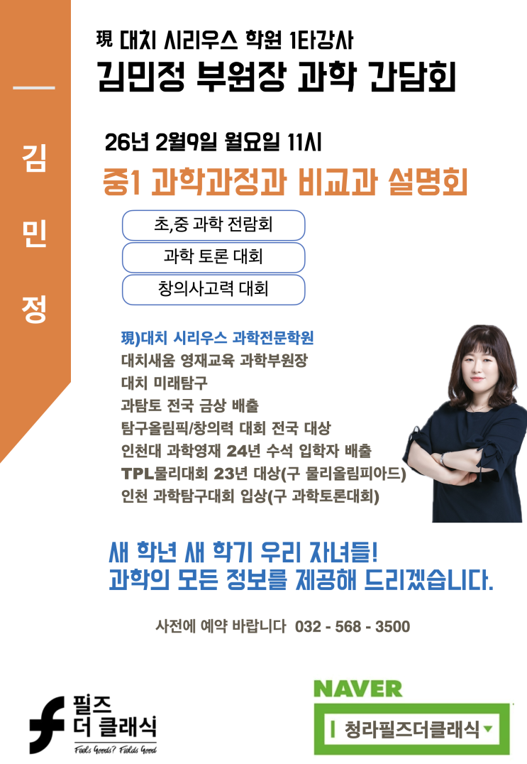 #필즈더클래식청라 중등 과학 과정과 비교과에 대한 궁금증을 해결하는 시간 영재학교나 과학고를 준비하는 친구들은 과학전람회나 과학토론대회 등에 대한 정보는 이미 알고 있으리라 생각합니다. 그러나 정확히 어떻게 준비해야 하는 것인지에 대한 것은 제대로 알고 있는 경우가 많지 않습니다. 20여년 이상 비교과 영역의 국내 최강자로 군림해 온 김민정 부원장을 초빙하여 영과고를 준비하기 위한 과정 혹은 초등부터 준비할 수 있는 각종 비교과 대회 등에 대한 준비과정 안내를 드리고자 합니다. 이미 김민정 부원장의 지도로 청라에서 인천대 영재교육원 수석입학자 배출과 과학탐구대회 입상 및 물리 올림피아드 대상이라는 놀라운 실....... <img src="https://blogthumb.pstatic.net/MjAyNjAxMjlfOTIg/MDAxNzY5Njg0ODc2Mzg2.RD893fNMN1B-5z0JYU8V5Iz_SCuQ1_KmNacz832fWIog.s6gCqVp1fvCEUJUng8YetXpKhowJGozuFdpKKLIhc2wg.PNG/%BD%BA%C5%A9%B8%B0%BC%A6_2026-01-29_%BF%C0%C8%C4_7.30.48.png?type=s3" />