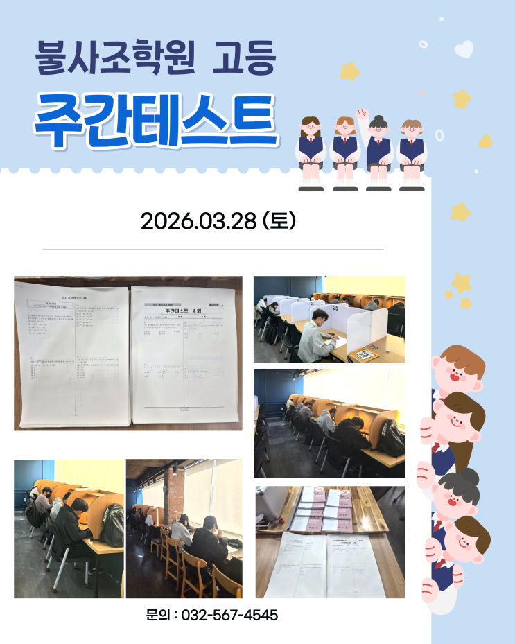 안녕하세요 중고등 입시학원 불사조 학원입니다. 3월 28일 토요일에 진행한 고등부 주간테스트 입니다 #가좌동학원 #가좌고입시학원 #가좌동입시학원 #서구입시학원 #가좌동중등학원 #가림고학원 #가좌고학원 #가좌동중등학원 #가좌동중등영어 #가좌동중등수학 #가좌동국어 #가좌동고등국어 #가좌동고등수학 #가림고 #가좌고 <img src="https://blogthumb.pstatic.net/MjAyNjA0MDNfMjEg/MDAxNzc1MjAyNTU2MzEw.9sZHfEnr7wPiTpPe5szvAIBbMP5KILve6HyNiZqZxvQg.x1c5nGG3NUo7fVor977yK6tJU-9q_vs2NLByvB1KYhMg.PNG/%C1%D6%B0%A3%C5%D7%BD%BA%C6%AE.png?type=s3" />