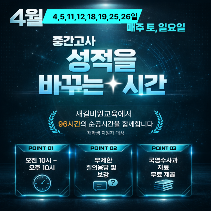 “문만 열고 들어오세요. 그 다음은 새길비원교육이 책임지겠습니다.” 성적만이 아니라 아이들의 태도와 가치관까지 함께 고민합니다. 결과보다 과정을 중요하게 생각하며 오늘도, 주말에도 멈추지 않고 달립니다. 가끔은 묻습니다. “하루 공부한다고 달라지나요?” 솔직히 말하면, 하루로 기적은 일어나지 않습니다. 하지만 올바른 공부습관과 꾸준한 노력은 결국 반드시 변화를 만듭니다. 그 변화가 쌓이면 어느 순간, 반전이 시작됩니다. 그리고 결국, 역전합니다. 조금 힘들어도 괜찮습니다. 아이들의 성적이 오르는 소리가 들리니까요. 반전과 역전을 만드는 곳, 새길비원교육입니다. <img src="https://blogthumb.pstatic.net/MjAyNjA0MDNfNTQg/MDAxNzc1MjEyODY1MzI1.qrjKuQ1CaKZ5nMXvTX43R93YqZQJ9ijn0EOGz2oC0Ssg.qWPjLnHdigbh8kykbPvgALhnS9DqKTUSnq3YN5C1U4Ag.PNG/1775212444692.png?type=s3" />