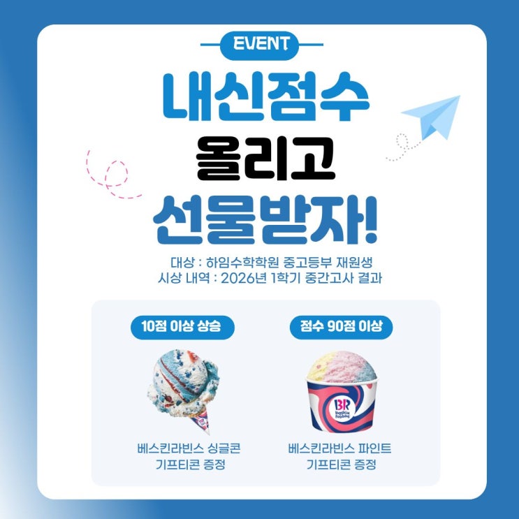 안녕하세요~ 개별 맞춤으로 수학 학습 지지력을 키워주는 하임수학학원입니다~! 하임수학학원 중,고등부 학생들을 위한 내신 점수 상승 이벤트가 2026년 1학기 중간고사에도 진행합니다~! ▶ 대상 : 하임수학학원 중고등부 재원생 ▶ 시상 내역 : 2026년 1학기 중간고사 점수 → 10점이상 상승 : 베스킨라빈스 싱글콘 기프티콘 → 점수 90점 이상 : 베스킨라빈스 파인트 기프티콘 하임수학학원 학생들이 좋은 점수를 받을 수 있도록 하임수학학원은 끝까지 함께 하겠습니다 https://blog.naver.com/turningmath/224218301636 <img src="https://blogthumb.pstatic.net/MjAyNjA0MDZfNzYg/MDAxNzc1NDUwNjA2OTk1.spOOH7lE_9CxeOQdtqtvAy-ijDXW5sUDjA2mJ_MO530g.jIF0qum2ZZEwqS0hybOh9MHRmGbPdZJHgDjm1N6BK2og.JPEG/%B3%BB%BD%C5%C1%A1%BC%F6_%C0%CC%BA%A5%C6%AE_%28%C4%AB%B5%E5%B4%BA%BD%BA%29.jpg?type=s3" />