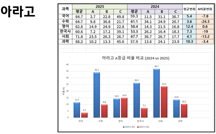원당고,아라고 2025 vs 2024 성취도 A 비율 비교