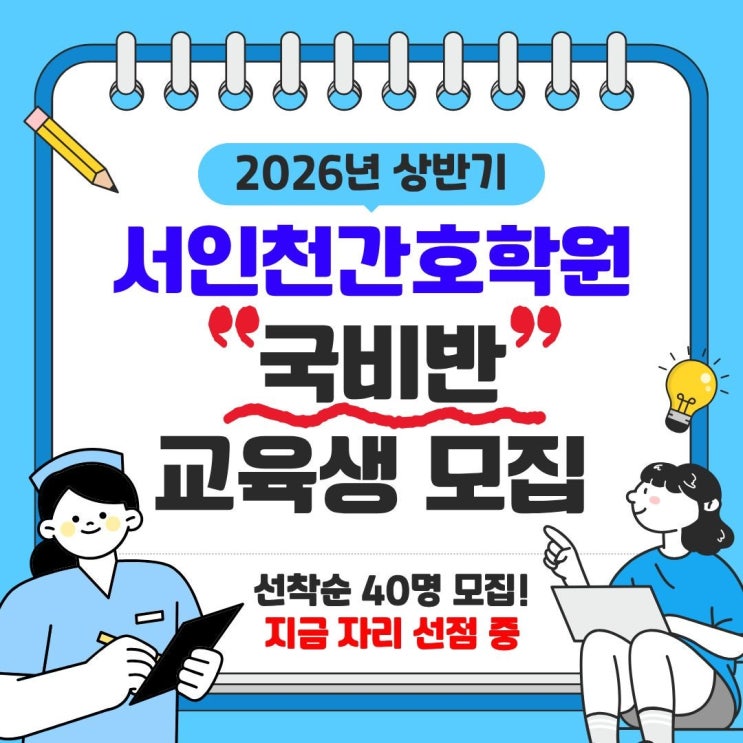 취업률 높은 간호학원 ★ 2026년 봄학기 국비교육생 모집★ 안녕하세요 제대로 가르치는 학원, 서인천간호학원입니다^^ 서인천간호학원 검단사거리(본점)에서는 2026년 봄학기 국비 교육생을 모집합니다! 육아맘을 위한 주간 국비반 • 교육기간 2026.03.09 ~ 2027.02.26(월~목)수업 (금,토,일, 공휴일 휴무) 국비반 정원제 운영 4자리 여유 선착순 마감예정!! 서둘러 등록하세요 직장인을 위한 야간 국비반 • 교육기간 2026.03.13 ~ 2027.03.05 월 부담금은 가볍게 시작해서! 전문자격 취득을 현실로 만들어요! 간호조무사 과정을 알아보실 때 가장 많이 물어보시는 질문이 바로 이거예요. “자격증 따고, 정말....... <img src="https://blogthumb.pstatic.net/MjAyNjAxMzBfMjM1/MDAxNzY5NzM2MzE3NDk3.1efP4tanVHEy2K8V-QP3rP0J2ZhhiHyZPnfBn7v8f_cg.iHsibNTiM73e0_Ymd0Vj0VJEX8iVFxmbHqgxjffKOugg.JPEG/1_%281%29.jpg?type=s3" />