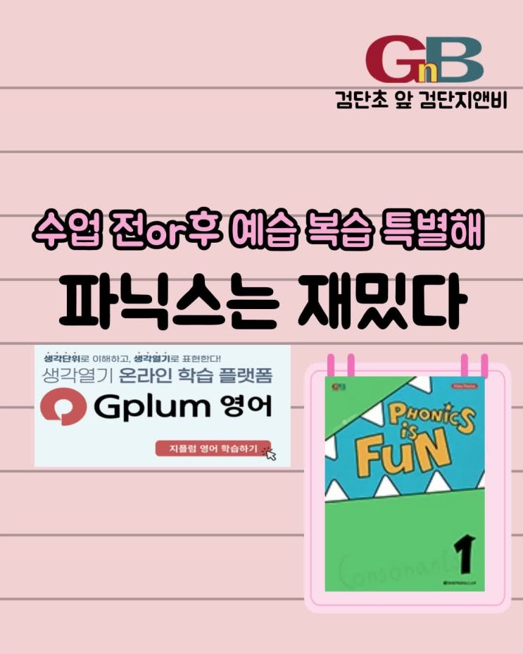 수업 전에는 예습, 수업 후에는 복습하는 특별한 프로그램 GnB Gplum GnB Gplum 파닉스 재밌다! # 네이버 or 구글 검색창에 Gplum를 검색하세요. 지앤비 Gplum 로그인 화면 다양하고, 재밌고, 학습효과 놀라운! 파닉스는 재밌다! Gplum 엿보기 G-plum Class - G-plum Test - G-plum plumwork 3개로 구성되어 있어요. G-plum Class 에서 Let's review , Lecture는 이전 챕터에서 배운 내용을 복습하고 수업시간에 배운 파닉스 발음을 입모양을 보며 정확하게 발음연습을 합니다. 파닉스, 정확한 발음 연습이 중요한 이유 1. 읽기 능력의 기초가 됩니다 파닉스는 아이가 처음 보는 단어도 스스로 읽어낼 수 있게 하는 도구입니다. 하....... <img src="https://phinf.pstatic.net/image.nmv/blog_2026_01_29_2548/fAHdSGuEO6_01.jpg?type=f480x480" />