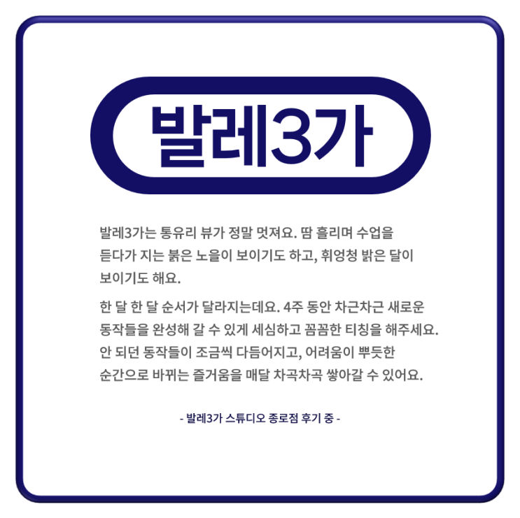 이곳 발레 메이트분들 열정은, 하나라도 더 알려주려고 하는 이곳 선생님을 닮아있어요 선생님도 하나하나 열정적으로 지도해주셔서 만족스럽습니다. 수강생분들도 모두 열심히 참여하는 분위기라 동기부여가 잘 되어요 좋은 공간에 좋은 사람들이 모여들듯 함께 하는 선생님들과 회원님들 한 분 한 분 열정적이고 젠틀하신 이곳, 발레3가입니다! 오늘 14시 종로점, 3월 신규회원 수강신청이 개시됩니다 오늘 10시 용산점, 3월 신규회원 수강신청이 개시됩니다 예약/문의: 카카오톡 채널 [발레3가 종로점/용산점] <img src="https://blogthumb.pstatic.net/MjAyNjAyMjdfMTc2/MDAxNzcyMTQ5NTMyMzgw.Te9Ic7FRpokElp4gpIgG6L1CQc-bQHRuXvp7FcyudKQg.8i8ahL1MEBWay4bLpjPoyEOxJbBbv9s1VK9A0FEI9GEg.PNG/1772103534993.png?type=s3" />