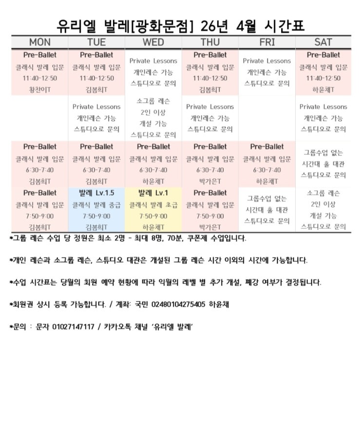 [유리엘 발레]광화문점 4월 시간표 종각/안국/시청/서대문/종로