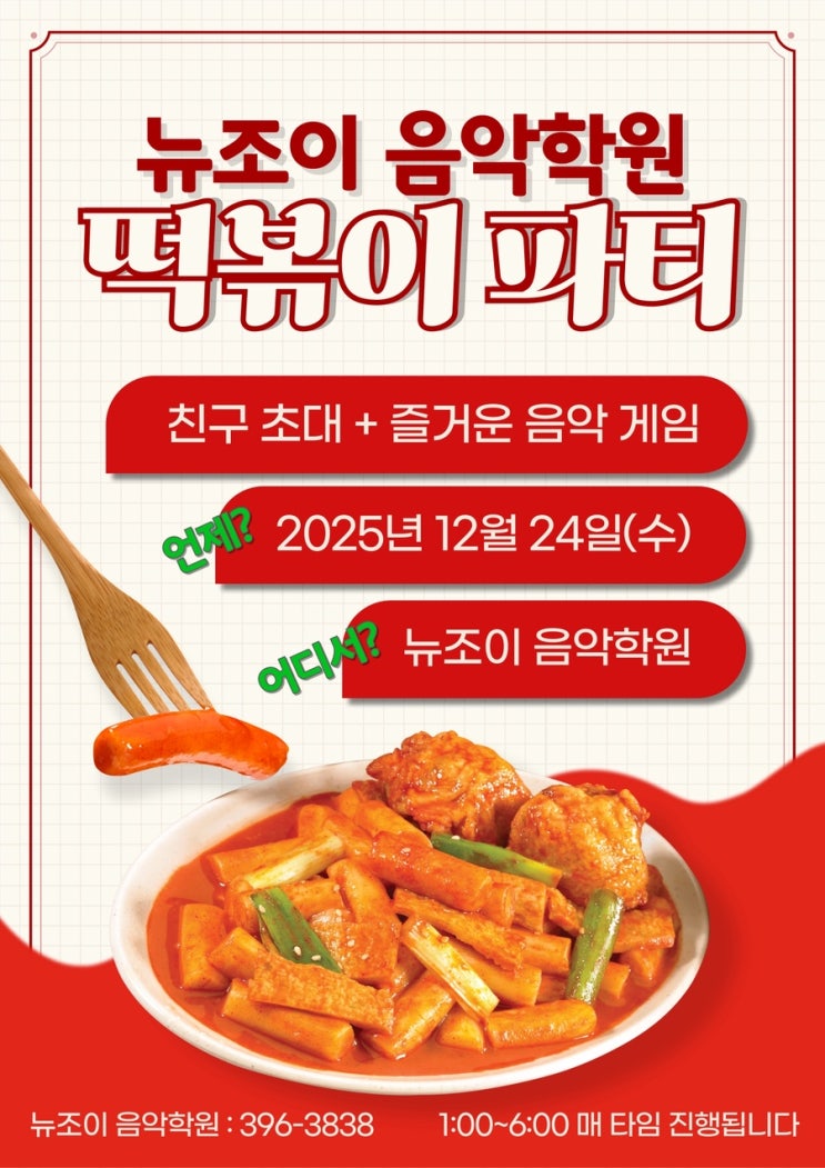 안녕하세요 오늘은 뉴조이 음악학원에서 아이들과 함께한 조금 특별했던 하루를 기록해보려고 합니다. 연습만 하는 시간이 아니라, 함께 웃고 즐기는 추억도 중요하니까요 이번 파티에는 학원 친구들뿐만 아니라 친구들도 초대해서 더 즐거운 분위기 속에서 진행되었습니다. 떡볶이를 먹기 전후로 간단한 음악게임도 함께 하며 자연스럽게 음악을 접하고, 서로 웃고 응원하는 시간을 가졌어요 처음 만난 친구들도 금방 어울리며 즐겁게 참여하는 모습이 인상적이었습니다. 아이들의 밝은 표정과 현장의 즐거운 분위기가 그대로 담긴 사진들입니다. 뉴조이 음악학원은 연주 실력뿐 아니라 함께하는 즐거움과 추억도 소중히 생각합....... <img src="https://blogthumb.pstatic.net/MjAyNjAxMDNfMTc3/MDAxNzY3NDM1MDQyNTI5.JryTeVbnNDK4QdsjScckpVLQkzYgfzUBNcqrhGtkcwYg.wip4_ZQSEycO1YtcjHzTegti4-hFp2CSSkPIhxEHWtEg.JPEG/IMG%A3%DF9853.JPG?type=s3" />