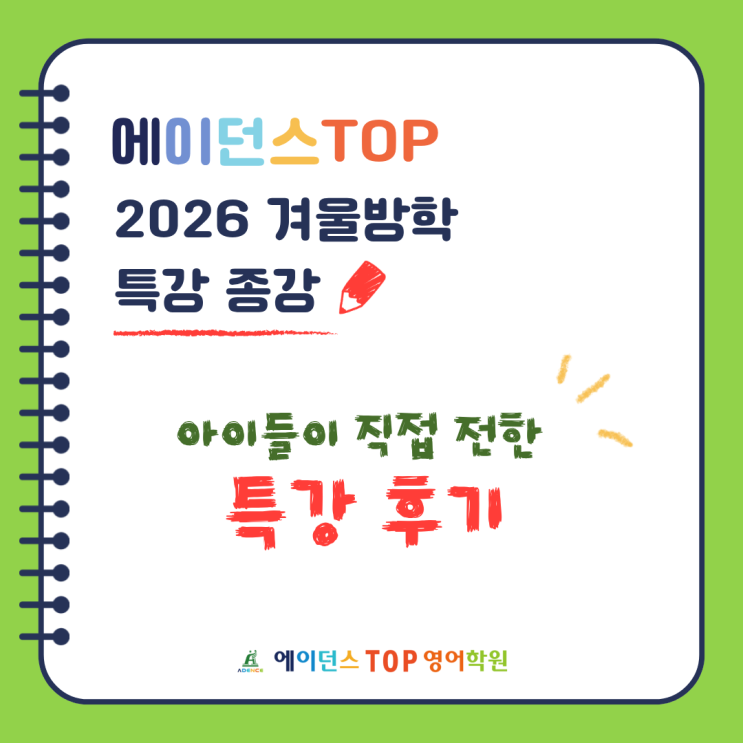 안녕하세요! 15년 이상 내공으로 중계 지역 학생들의 영어 성적을 고득점으로 이끌고 있는 에이던스TOP 영어학원입니다. 2026 겨울방학 동안 진행된 에이던스TOP 겨울특강이 모든 과정을 마무리했습니다. 이번 겨울은 ‘많이 하는 공부’가 아니라 ‘제대로 쌓는 공부’에 집중했던 시간이었습니다. 영문법 특강 문법을 다시 정리하고, 문장에 정확히 적용하는 훈련을 반복했습니다. 이번 특강을 통해 아이들은 이렇게 적어주었습니다. “NEIT에서 문법실력이 향상했고, 평소 어려워하던 것들을 더 쉽게 배울 수 있어서 좋았다.” “문법을 집에 가서 그날씩 복습하면 더 머리에 잘 들어온다는 것을 알게 되었다.” “예전에 대충 알고 넘겼....... <img src="https://blogthumb.pstatic.net/MjAyNjAyMjdfMTAw/MDAxNzcyMTkxMDUwMzIz.__6CHRAnPnTMYY-4BZaHkR4JZk_mVTh1E-Rjato9XZYg.wysj-dGSvvlSlnkRJMM_MgH1rDY5p26ZtZIT8Y6BiNYg.PNG/%B0%B3%B0%AD_%BD%BA%C4%C9%C4%A1_%C4%AB%B5%E5%B4%BA%BD%BA_%285%29.png?type=s3" />