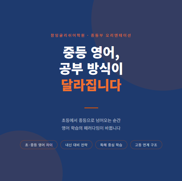 안녕하세요! 참잉글리쉬어학원입니다 최근 중학교 1학년 학생들을 위한 영어 오리엔테이션이 학생들의 적극적인 참여 속 성황리에 진행되었습니다! 중학교에 입학하며 새로운 환경에서 영어 공부를 시작하게 되는 만큼 앞으로 어떤 방향으로 공부하게 되는지 학생들이 이해할 수 있도록 안내하는 시간을 마련했답니다! 중등 영어, 초등과는 공부 방식이 달라집니다 이번 오리엔테이션에서는 초등 영어에서 중등 영어로 넘어오면서 어떤 변화가 생기는지를 학생들에게 설명했습니다. 학사일정 안내 오리엔테이션에서는 학생들이 앞으로 1년 동안 어떤 흐름으로 공부하게 되는지 학사 일정도 함께 안내했습니다. 참잉글....... <img src="https://blogthumb.pstatic.net/MjAyNjAzMDZfMjAz/MDAxNzcyNzYwMDQwNTk0.T6n4gbJnXYcMcbS8UwCfkUt6x5bRZvEKvdW9uw5hn8wg.7ojguSKsRidn6GiK_2f9frLx4FVyUMmlpjtJ9nvU--cg.PNG/image.png?type=s3" />