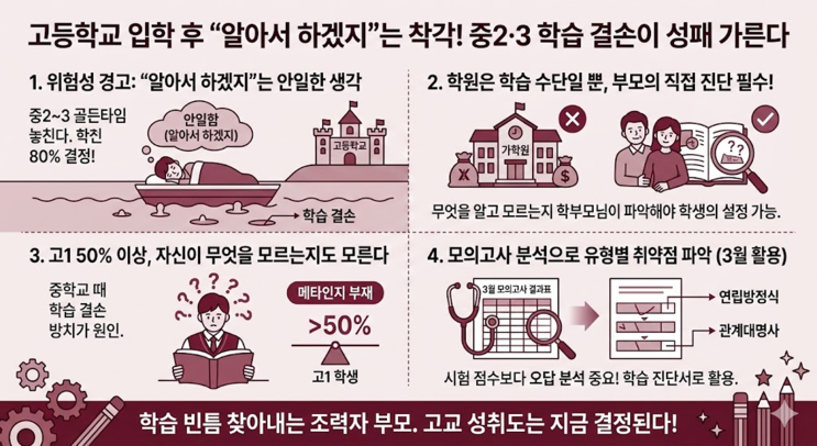 "고등학교 가면 하겠지"는 착각... 중2·3 학습 결손이 고교 성패 가른다 "고등학교에 입학하면 알아서 공부하겠지"라는 생각은 매우 위험한 착각이다. 중학교 2학년부터 3학년까지의 시기는 학생의 학습 상태를 정밀하게 파악해야 하는 골든타임이다. 단순히 학원에 보내는 것만으로는 부족하다. 부모가 직접 학생이 무엇을 알고 무엇을 모르는지 확인하는 과정이 반드시 필요하다. 학원에 보내는 것이 '학습 파악'은 아니다 많은 학부모가 자녀를 학원에 보내는 것으로 부모의 역할을 다했다고 생각한다. 하지만 학원 수강은 학습의 과정일 뿐, 상태 파악의 척도가 아니다. 학생이 무엇을 정확히 인지하고 있으며....... <img src="https://blogthumb.pstatic.net/MjAyNjAyMjdfNiAg/MDAxNzcyMTQwMzQ3Njcw.rNA22XYUqLTiai3GVZjZHZbyddNFOlpgQ14BosxJjhAg.fWDCn8IcbLaPpMkwgadUS8BhbbiCis6eoh5JpbsYpQUg.PNG/image.png?type=s3" />