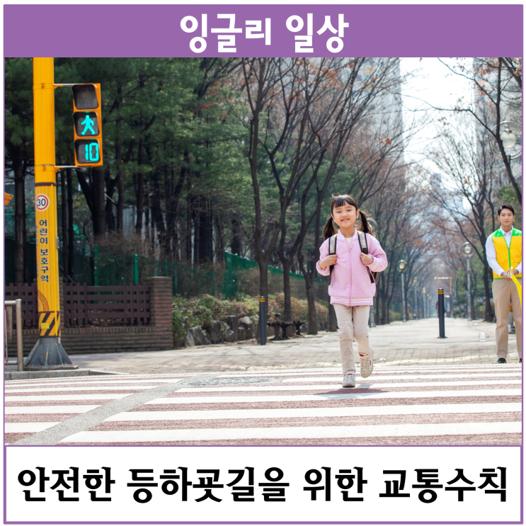 안녕하세요. 잉글리시아이입니다:) 새 학년, 새 학기가 시작됩니다. 이제는 매일 학교와 집을 오가는 길을 걷게 될 텐데요. 건강하고 즐거운 매일을 보내기 위해 교통 수칙을 꼭 지키는 것이 중요한데요. 오늘은 안전하게 등하굣길을 다닐 수 있도록 교통 수칙을 알아보도록 해요! 횡단보도 신호 지키기! 안전한 등하굣길뿐만 아니라 일상에서도 가장 준수해야 하는 교통안전 수칙은 횡단보도 신호를 지키는 것입니다. 신호등이 빨간불일 때는 절대 건너지 말고, 한 발 뒤로 물러서서 기다립니다, 초록불이 켜지면 바로 뛰어가지 말고, 먼저 차가 오는지 좌우를 살핀 후 천천히 신호를 건너도록 하며, 건너는 동안에도 차가 오는지 계속 확인하도....... <img src="https://blogthumb.pstatic.net/MjAyNjAyMjhfOTEg/MDAxNzcyMjkwNDU2Njk0.IJEHWEH6ROG6EpqQ5v6Brut8acJ7mBkvmNlGHmli7vwg.ERnjCIXvvzI7UtkdOxU7wGtvwnzMefBK0x2b9IiAbFwg.PNG/%B1%D7%B8%B21.png?type=s3" />