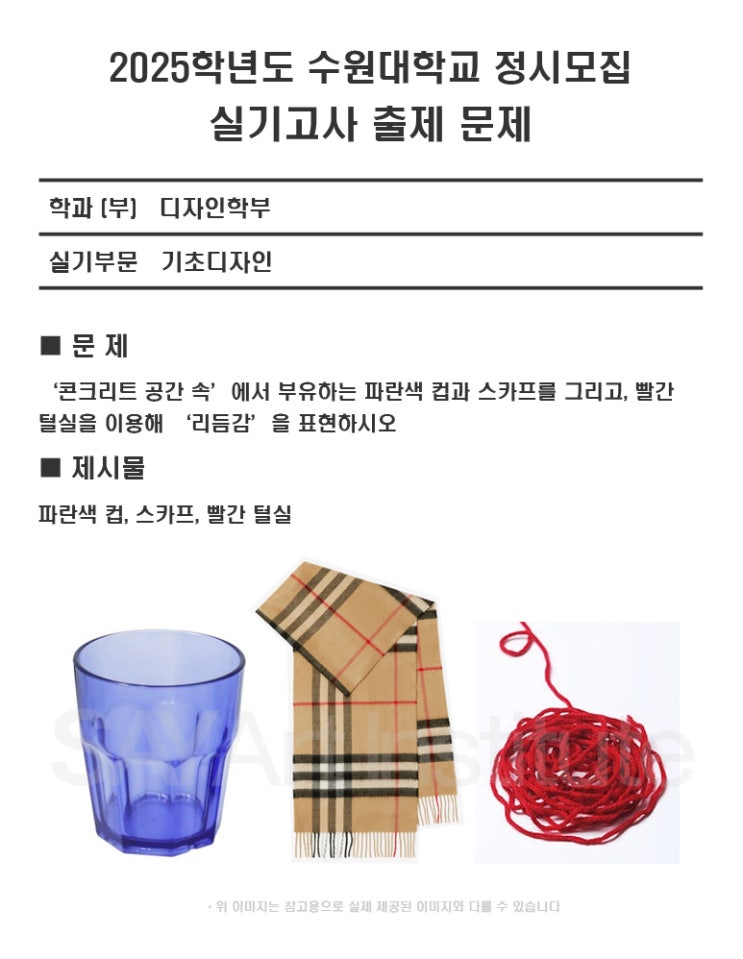 실기중심미술학원 SAY 미술학원입니다. 수원대 2025학년도, 2024학년도 정시 <나군> 기초디자인 문제 수원대학교는 25학년도까지 디자인학부로 신입생을 모집했지만, 26학년도부터 커뮤니케이션디자인, 공예디자인, 패션디자인으로 나누어 선발합니다. 실기 유형과 반영비에는 변동 사항이 없습니다. 정시 반영비 - 수능 20% + 실기 80% 수능 반영 방법 - 국어, 수학, 영어, 탐구 중 2개 영역 각 50% (탐구 : 1과목) 25학년도 수원대 디자인학부 정시 모집인원 및 경쟁률 | 35명 | 23.31 : 1 중랑 신내 SAY 미술학원 : 02 432 6220 광진 중곡 SAY 미술학원 : 02 457 6220 - 수원대학교 2025학년도 수시 주제 및 실기 가이드 - https://blog....... <img src="https://blogthumb.pstatic.net/MjAyNjAxMTRfNzgg/MDAxNzY4MzYwNzQwMDM2.X7tQJTh1BsRz3XXjqE0SS7QRIjNNghOq-QC-Lougm2og.jWRvujduE8f7HXN0ri7lb3HdhS4Chz22Oi9CkJIQNQEg.JPEG/%B3%AA%B1%BA_%BC%F6%BF%F8%B4%EB_17.jpg?type=s3" />